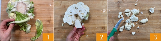 Para preparar las coliflores en freidora de aire, primero limpia la coliflor: elimina las hojas más externas 1 y el tallo central 2, luego corta los ramilletes en trozos más pequeños 3.