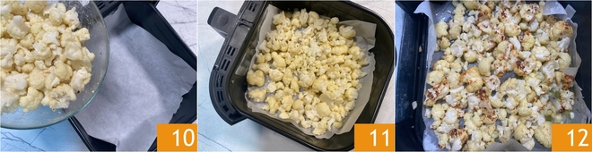 Transfiere las coliflores así sazonadas en la cesta de la freidora de aire revestida con papel de horno (nosotros utilizamos una freidora con capacidad de 6 litros) 10 y cocina a 180° durante 10 minutos 11. Al término del tiempo de cocción, deberán estar bien doradas 12.
