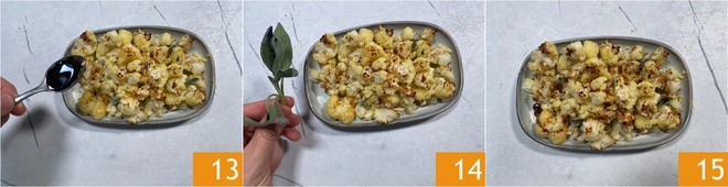 Emplata las coliflores y completa con el vinagre balsámico 13, la ralladura de limón y algunas hojitas de tomillo y salvia 14. ¡Tu coliflor en freidora de aire está lista para ser servida 15!