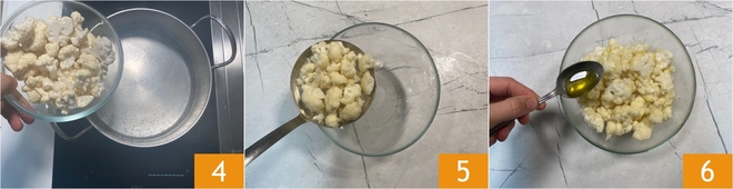Sumérgelas en agua hirviendo y cocínalas durante 5 minutos 4. Escurre las coliflores en un bol 5 y sazónalas con aceite de oliva virgen extra 6.