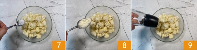 Añade también la sal 7, el Parmigiano Reggiano rallado 8 y una pizca de pimienta negra 9.