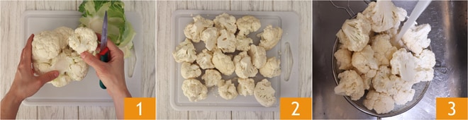 Para realizar la coliflor en sartén con aceitunas, desala las alcaparras pasándolas bajo agua corriente y dejándolas en remojo en agua fría. Limpia la coliflor eliminando las hojas externas 1, retira los ramilletes 2 y luego lávalos bien 3.