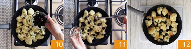 las aceitunas negras 10, los filetes de anchoas escurridos del aceite de conservación 11 y saltea todo a fuego alto para que se sazonen bien: tardará unos 5-6 minutos. Completa con perejil y sirve inmediatamente la coliflor en sartén con aceitunas 12.