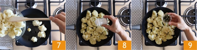 Añade los ramilletes de coliflor 7 y con una cuchara de madera remueve. Continúa la cocción a fuego medio durante unos 2 minutos y ajusta de sal 8 y pimienta. En este punto agrega las alcaparras desalada bien escurridas y secas 9,