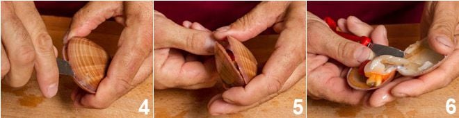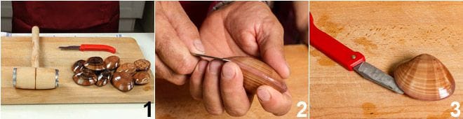 Para limpiar y utilizar las almejas necesitaréis un cuchillo con la punta redondeada y la hoja delgada y un mazo de cocina para ablandar carne. Existen dos tipos de almejas: una con la concha más clara y otra con la concha más oscura: el sabor y la consistencia de la carne, sin embargo, son las mismas 1. Para limpiar correctamente las almejas es necesario abrirlas incidiendo los dos músculos laterales internos. Sosténgalas teniendo cuidado de colocar la parte más corta de la concha hacia abajo en la palma de la mano 2. Insertad la hoja entre las dos valvas ayudándoos con la presión del dedo. Insertad la punta plana del cuchillo hasta el fondo 3 y
