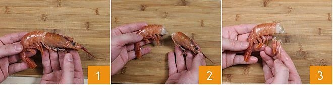 Para limpiar los langostinos, primero enjuagadlos bajo el agua corriente, luego colocadlos sobre una tabla de cortar y separad la cabeza (1-2). Luego, siempre usando las manos, quitad las patas 3