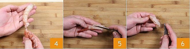 y el caparazón 4, es decir, la coraza que protege las carnes. Podéis decidir en este caso, dependiendo de la preparación que queráis hacer, si dejar o no la parte final de la cola. Una vez limpio externamente, proceded a realizar una operación muy delicada, es decir, quitar el intestino interno: haced un corte en el dorso del langostino con un cuchillito 5 y eliminadlo tirando suavemente 6, procurando no romperlo.