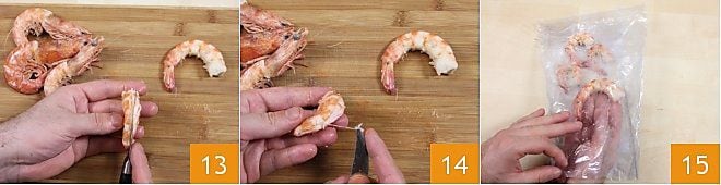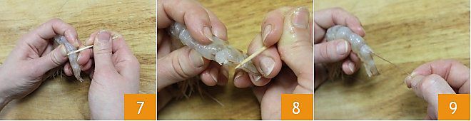 Podéis realizar esta operación también con un palillo: insertadlo en la carne del langostino 7, localizad el intestino y tirad para eliminarlo (8-9).