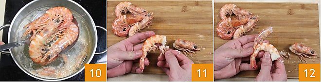 Podéis limpiar los langostinos también cocidos: escaldadlos durante unos minutos en agua hirviendo, dejadlos sumergidos durante 4-5 minutos y escurridlos con una espumadera 10; dejadlos enfriar durante un par de minutos y luego proceded con la limpieza. Eliminad la cabeza, las patas y el caparazón (11-12), también en este caso podéis dejar la cola.