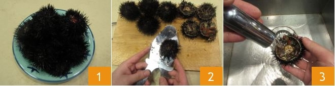 Limpiar los erizos de mar es una operación muy simple, para realizarla solo necesitarás una herramienta específica: el cortador de erizos. Para saber si están frescos presta atención a solo una cosa: deben oler a mar. Procede entonces tomando tus erizos 1 y comienza a abrirlos utilizando la herramienta indicada. Corta la parte superior del erizo 2 que se reconoce por la boca, cortada esta parte vacía el erizo del agua y las algas que tenga dentro y enjuágalo bajo el agua corriente 3.
