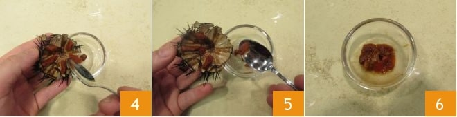 Procede en este punto a extraer los huevos ayudándote con una cucharita 4, luego toma solo la parte naranja 5. Colócalos en un cuenco 6 y úsalos como prefieras. Son particularmente apreciados por su sabor y compacidad aquellos de un rojo coral intenso. Los erizos de mar son excepcionales tanto crudos como cocidos.