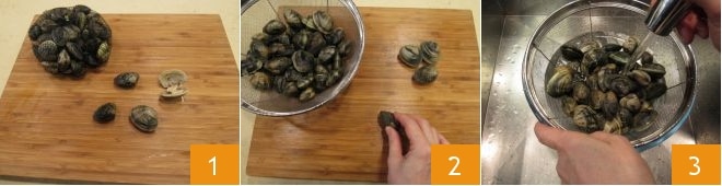 Para limpiar las almejas, primero deben seleccionar las almejas, eliminando las que están abiertas o rotas 1, porque al estar muertas, podrían ser arriesgadas o tener un mal sabor. Luego golpéenlas sobre una superficie o una tabla de cortar cada almeja 2, para que pierdan ya un poco de arena e impurezas. Colóquenlas en un colador apoyado sobre un bol (asegúrense de que no toque el fondo) y enjuáguenlas varias veces bajo agua corriente 3. Pueden dejarlas en remojo por algunos minutos, luego cambiar el agua varias veces, hasta que en el fondo del bol ya no queden residuos de arena.