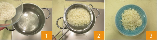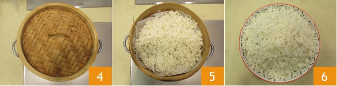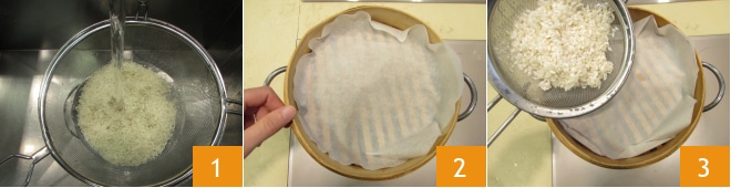 Para preparar el arroz al vapor, empezad poniendo en el fuego una olla de agua y llevadla a ebullición. Mientras tanto, enjuagad el arroz 1 y escurridlo. Colocad una hoja de papel de horno en la vaporera 2 y ponedla sobre la olla. Luego trasladad el arroz 3 y distribuidlo por toda la superficie.