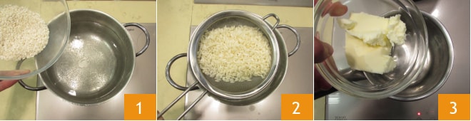 Para preparar el arroz con mantequilla y Parmesano, comenzad hirviendo el arroz: vertedlo en agua hirviendo y salada 1 y después de unos 20 minutos escurridlo 2. Mientras tanto, verted la mantequilla en un cazo 3.