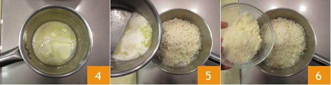 Dejad que se derrita a fuego muy bajo 4 y cuando esté fundida, vertedla en la olla con el arroz escurrido 5. Coced a fuego bajo unos instantes hasta que la mantequilla se haya absorbido. En este punto, añadid el Parmesano rallado reservando un poco 6.