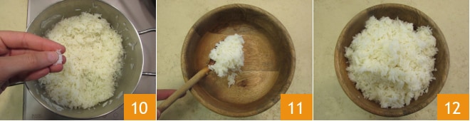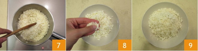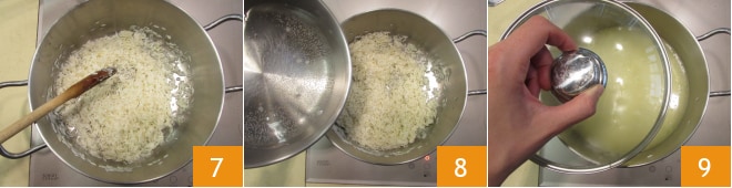 Una rápida mezcla 7 y verted el agua caliente 8. Cubrid inmediatamente con la tapa y coced durante unos 10 minutos sin remover 9.