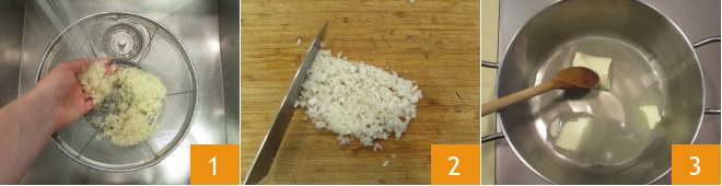 Para preparar el arroz pilaf, comenzad calentando el agua en un cazo. Continuad enjuagando el basmati bajo un chorro de agua 1. Escurridlo y mientras tanto limpiad y picad la cebolla 2. Luego poned a derretir la mantequilla en un cazo a fuego bajo, para no quemarla 3.