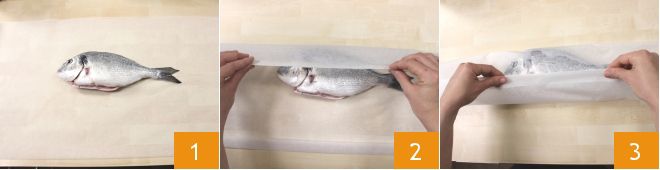 PAPILLOTE DE PAQUETE DE REGALO El papillote de "paquete de regalo" es el más fácil de realizar, y puede usarse para cocinar, por ejemplo, peces enteros, como una dorada o una lubina. Para realizar este tipo de papillote, recorta un rectángulo de papel de horno que sea más largo y ancho que el pescado que debes preparar, luego coloca la dorada en el centro de la hoja 1 y pliega los lados largos del papel de horno sobre el alimento 2 y superpónlos 3,