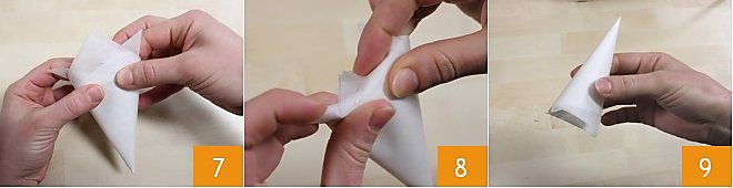 Os encontraréis con un cono con 3 puntas hacia arriba 7: siguiendo su dirección, doblad las puntas hacia dentro del cono 8. Vuestro cucurucho está listo para ser rellenado 9.