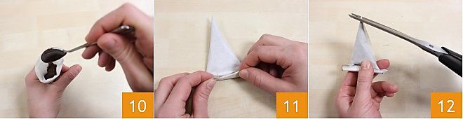 Con una mano mantened el cucurucho y con la otra rellenadlo 10 justo más allá de la mitad con el chocolate fundido, por ejemplo, y una vez realizada esta última operación, doblad el cono hacia la punta para cerrarlo 11. Presionad ligeramente el cono para empujar el chocolate hacia abajo. Podéis cortar la punta formando un orificio de salida más ancho o más estrecho según el uso que queráis darle 12. ¡Vuestro cucurucho con papel de horno está listo, ahora podéis dar rienda suelta a vuestra creatividad con las decoraciones!