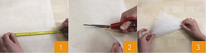 Para realizar un cucurucho con papel de horno, dibujad con un lápiz y una regla un cuadrado de 20x20 cm 1, cortadlo 2 y doblarlo por la mitad para formar un triángulo 3.