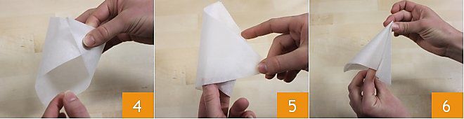 Unid las dos esquinas de la base 4, superponedlas, enrollad los bordes del papel de horno sobre sí mismos 5 y cerrad hasta formar un cono (la punta debe estar formada por la base del triángulo) 6.