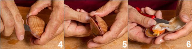 hazla deslizar lateralmente teniendo cuidado de mantener la hoja inclinada hacia arriba 4. Fuerza ligeramente el caparazón para abrirlo, gira la hoja e incide lateralmente el otro músculo (5-6).