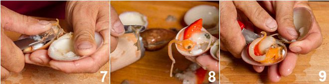 Ahora procede eliminando la película grisácea que cubre el fruto y la bolsa intestinal que contiene piedrecillas que, si se dejan dentro, darán la sensación de arena en el producto (7-8). Separa el fasolario también de la parte inferior de la concha 9. Si deseas consumirlo crudo, el fasolario está listo y, teniendo cuidado de retener su líquido dentro de la concha, puedes condimentarlo con un poco de pimienta o jugo de limón.