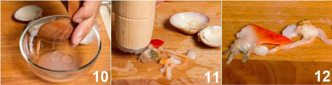 Si deseas usarlo cocido, en cambio, después de recoger en un cuenco el líquido del molusco 10, extrae el fruto de la concha y colócalo sobre una tabla de cortar. Con la ayuda de un pequeño mazo para carne como este, ablanda la carne del fasolario, insistiendo en el pie rojo, hasta que se vuelva delgada, íntegra y tierna (11-12).