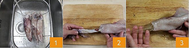 Limpiar los calamares frescos es una operación sencilla. Todas las partes del molusco pueden ser utilizadas, así que una vez separadas del cuerpo central, resérvalas. Comienza las operaciones enjuagando los calamares bajo agua corriente 1, luego con las manos separa delicadamente la cabeza del manto y resérvala 2. Una vez extraída la cabeza, siempre con las manos, busca la pluma de cartílago transparente que se encuentra en el manto y extráela delicadamente 3.