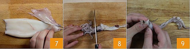 Para terminar la limpieza del manto, siempre con un cuchillo pequeño, retira las aletas para utilizarlas en las preparaciones 7. Ahora retoma la cabeza que habías reservado y sepárala de los tentáculos cortando con un cuchillo pequeño justo debajo de los ojos 8. Toma los tentáculos y elimina el diente central de la siguiente manera: abre los tentáculos hacia fuera con las manos y empuja hacia arriba la parte central (es decir, la boca) 9. Si el calamar es de gran tamaño, puedes evitar separar la cabeza de los tentáculos: solo extrae los ojos y priva al calamar del diente.