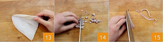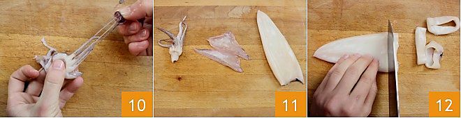 En este punto, con las manos, tira de la piel de los tentáculos 10. Enjuaga cuidadosamente todas las partes del calamar limpio bajo agua corriente, así estarán listas para ser cortadas según las preparaciones que elijas 11. Comienza por el manto, que se puede dejar entero si decides preparar calamares rellenos. Alternativamente, para freírlo, se puede cortar en anillos con un cuchillo. Si el calamar es muy grande, te recomendamos hacer anillos bastante finos para facilitar la cocción 12.