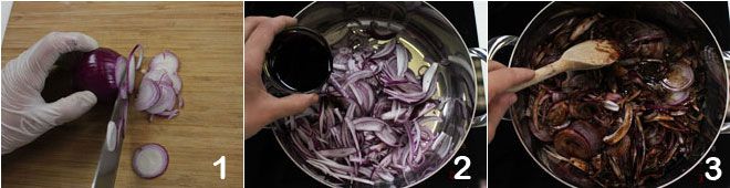 Para preparar la compota de cebollas de Tropea al balsámico, empieza por limpiar las cebollas: lava, pela y corta en rodajas las cebollas 1 (para esta operación recomendamos usar guantes desechables para evitar que quede el olor de la cebolla en las manos). Toma una cacerola, añade las cebollas y el vinagre balsámico 2, y deja pochar durante 10 minutos a fuego lento, removiendo frecuentemente 3.