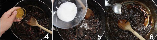 Cuando las cebollas estén pochadas, añade la miel 4 y el azúcar 5 y deja cocinar durante unos 45 minutos a fuego muy lento, continuando a remover a menudo 6; comprueba que la compota se mantenga suave y no tienda a "caramelizar". Pasado el tiempo indicado, verifica la cocción haciendo la prueba del platito: vierte una cucharadita de compota de cebollas de Tropea al balsámico sobre un platito inclinado, estará lista si no tiende a escurrirse sino que permanece bastante compacta y homogénea; en caso contrario, ponla a cocinar un poco más.