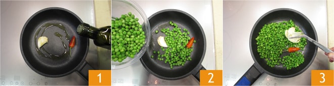 Para preparar los conchiglioni con mortadela y guisantes, empezad con el condimento: en una sartén, verted un chorrito de aceite y añadid el diente de ajo y la guindilla entera 1. Dejad que los ingredientes se doren durante 2-3 minutos y añadid los guisantes 2. Saltead los guisantes a fuego vivo durante 5 minutos, apagad el fuego y salpimentad al gusto. Eliminad el ajo y la guindilla 3. Reservad.