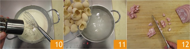 Aromatizad con pimienta al gusto 10. Una vez lista, verted la bechamel en una fuente amplia y baja y cubrid con papel de horno en contacto. Reservad a temperatura ambiente hasta su uso. Coced los conchiglioni en agua hirviendo salada durante 8-10 minutos, deberán estar al dente 11. Mientras tanto, cortad la mortadela en cubitos de aproximadamente ½ cm 12.