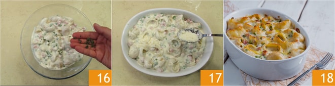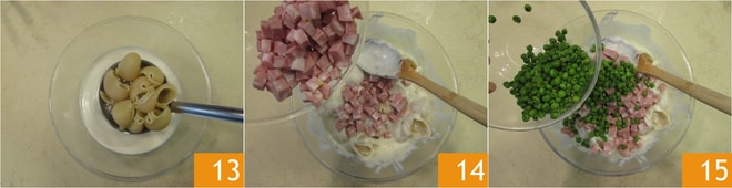 En un bol grande, verted la bechamel y los conchiglioni cocidos al dente 13. Mezclad los ingredientes y añadid también la mortadela 14 y los guisantes 15.