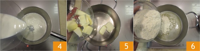 Preparad la bechamel: verted la leche en un cazo y calentadla 4. Poned la mantequilla en otro cazo y dejad que se derrita a fuego lento 5, luego añadid la harina de una sola vez 6. Mezclad vigorosamente para evitar la formación de grumos.