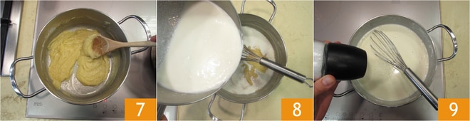 Continuad mezclando hasta obtener una mezcla dorada, el roux 7. En este punto, atenuad el roux vertiendo primero un poco de leche caliente y luego todo el resto 9. Continuad mezclando a fuego lento hasta alcanzar la consistencia deseada; cocinando la bechamel durante 5-6 minutos obtendréis una densidad media. Salpimentad al gusto 9.