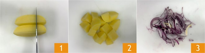 Para preparar el conejo al microondas, lo primero que debes hacer es pelar las patatas, cortarlas en cuartos 1 y luego en trozos 2. Corta la cebolla en juliana 3 y reserva.