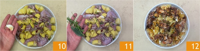 Transfiere todo a una bandeja ligeramente engrasada, añade el ajo 10, el tomillo y la salvia 11. Cocina en microondas a 800 W durante 40 minutos. Luego continúa la cocción otros 10 minutos en modo grill. El conejo al microondas está listo para ser servido 12.