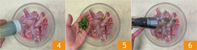 En un bol pon el conejo en trozos, añade el aceite 4, el romero 5, ajusta de sal y pimienta 6.
