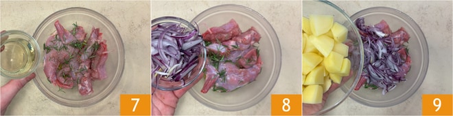 Vierte en el bol también el vino blanco 7 y el caldo de verduras. Agrega las cebollas 8 y las patatas 9. Mezcla para que tome sabor.