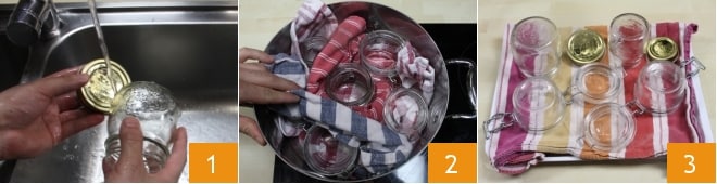 Para preparar la confitura de higos y vainilla, comenzad con la desinfección de los tarros y las tapas que servirán para conservar la confitura, siguiendo las directrices indicadas por el Ministerio de Sanidad al final de la receta. Lavád los frascos bajo agua corriente 1 y colocadlos dentro de una olla amplia. Insertad paños entre los varios frascos, para evitar posibles golpes durante la ebullición. Llenad con agua hasta cubrir completamente los frascos 2 y dejad hervir a fuego bajo durante 20 minutos, luego añadid también las tapas y dejad hervir 10 minutos más. Apagad el fuego y dejad enfriar. Una vez fríos, tomad los frascos y dejadlos secar completamente sobre un paño de cocina limpio 3.