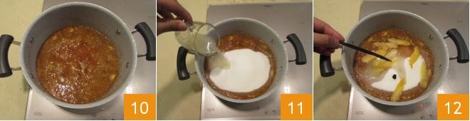 Una vez que la mezcla de higos haya alcanzado el hervor 10, añadid el azúcar, el jugo del limón 11, la corteza, la vaina de vainilla y sus semillas 12.