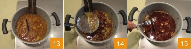 Mezclad todo y continuad cocinando 13 hasta que la confitura alcance los 104° (utilizad un termómetro de cocina para medir la temperatura correcta). Durante este tiempo, utilizad una espumadera para eliminar la espuma que se formará en la superficie 14, para obtener una compota brillante una vez enfriada. Tan pronto como alcance la temperatura adecuada, retirad la confitura del fuego y eliminad la vaina de vainilla 15.