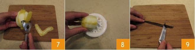 Mientras tanto, con la ayuda de un pelador de patatas, pelad el limón 7, reservando la corteza, y extraed su jugo, filtrándolo 8. En este punto, cortad la vaina de vainilla y raspad las semillas con un cuchillo afilado 9.