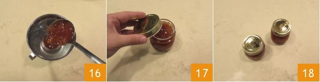 Dejad que se temple hasta que en la superficie se forme una ligera capa, luego mezcladla y envasadla en los frascos desinfectados, utilizando un cucharón o el embudo especial para confituras 16. Llenad los tarros teniendo cuidado de dejar 1 centímetro desde el borde y enroscád bien las tapas sin apretar demasiado 17. Dejad enfriar 18. Con el calor de la confitura se formará el vacío, lo que permitirá conservar el producto por mucho tiempo. Una vez que los tarros se hayan enfriado, verificad si el vacío ha ocurrido correctamente: podéis presionar en el centro de la tapa y, si no oís el clásico "click-clack", el vacío se habrá realizado. ¡Vuestra confitura de higos y vainilla está lista para ser degustada!