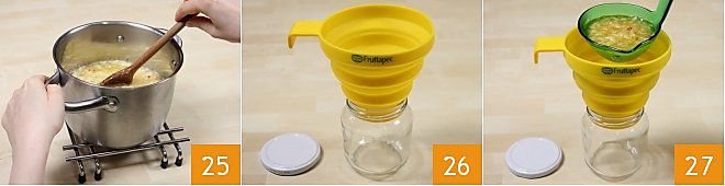 Retire la cacerola del fuego y mezcle, disolviendo la posible espuma 25. Prepare los tarros, que habrá sanitizado, y consiga un embudo para facilitar el envasado de la confitura 26. Vierta la confitura aún caliente en los tarros, con la ayuda de un cucharón 27 y