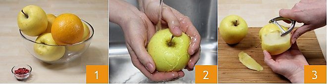 Para preparar la confitura de manzanas y naranjas con pimienta rosa 1, primero lave las manzanas bajo el agua corriente 2. Con un pelador, pele las manzanas 3,